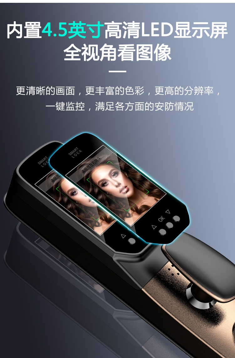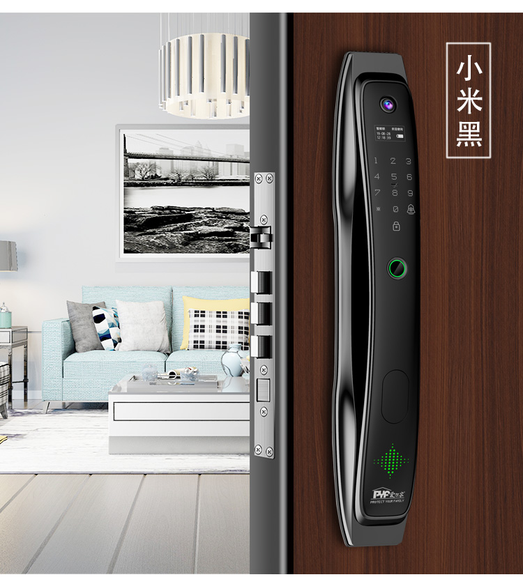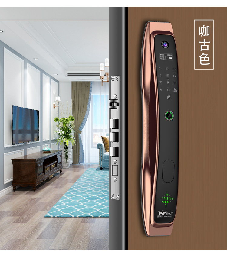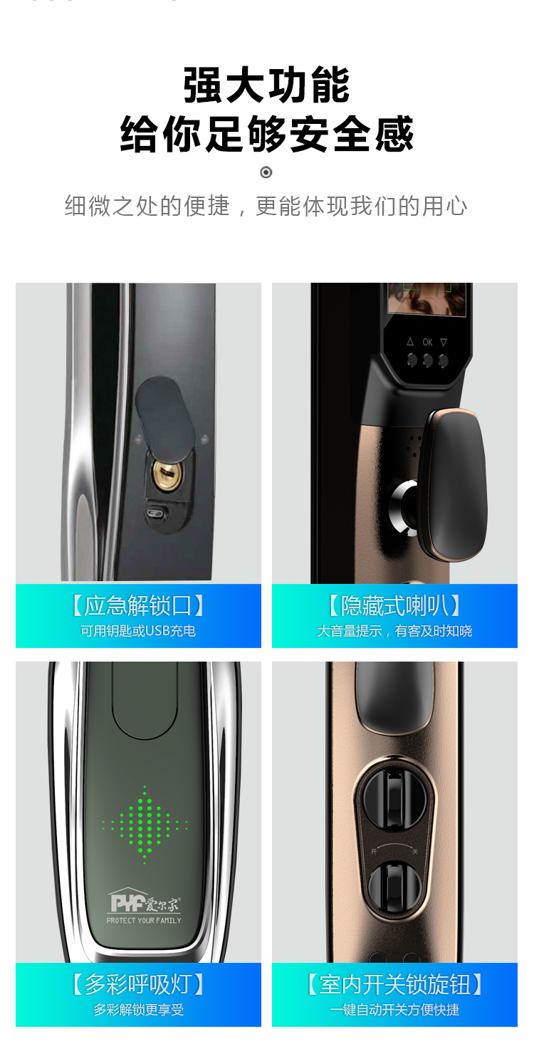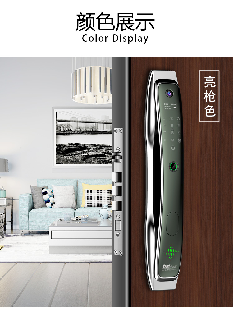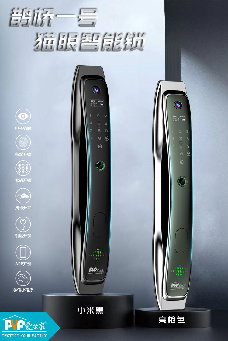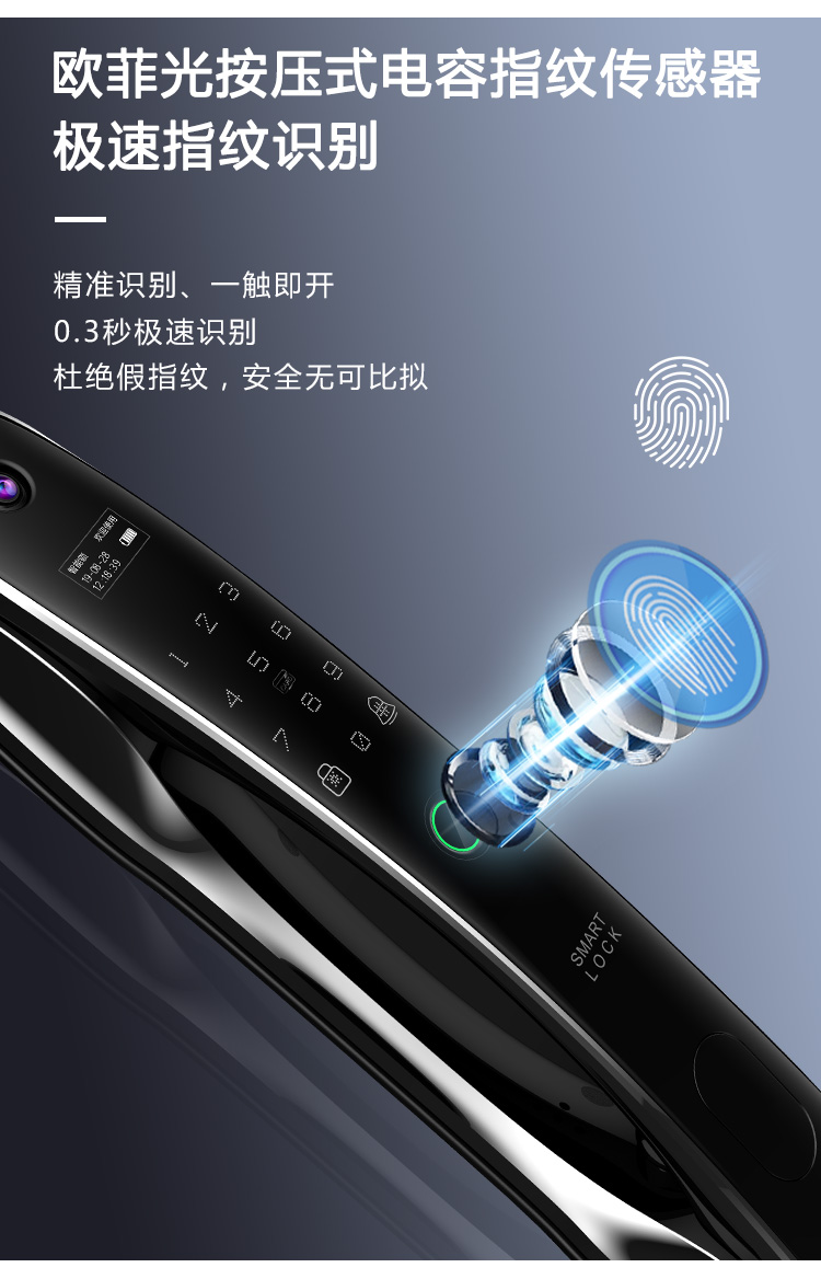 密码+指纹+MF卡+钥匙+微信小程序+单机猫眼/无线(选配);全自动智能锁,防暴力破坏更安全;锌合金一体成型,倍感坚固厚实;外观采用锌合金电镀+IMD注塑高光工艺;欧菲光品牌炫彩指纹
