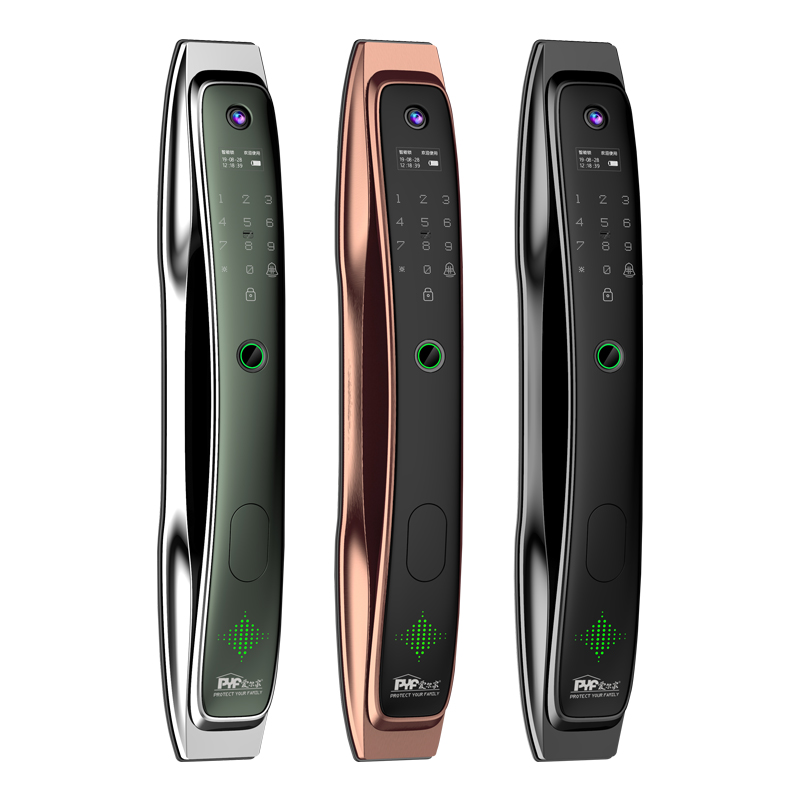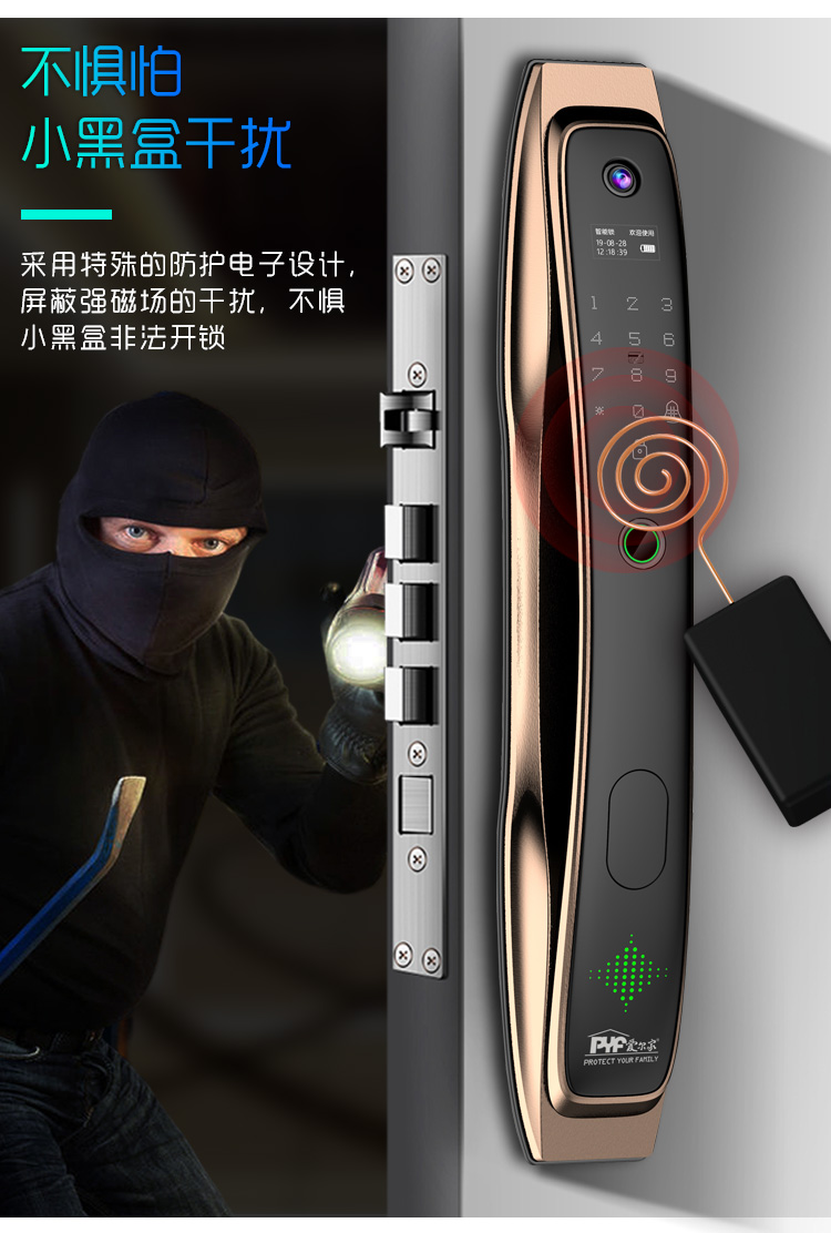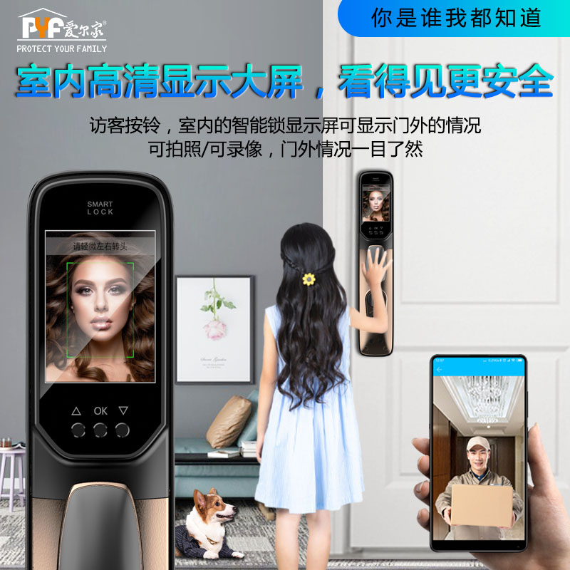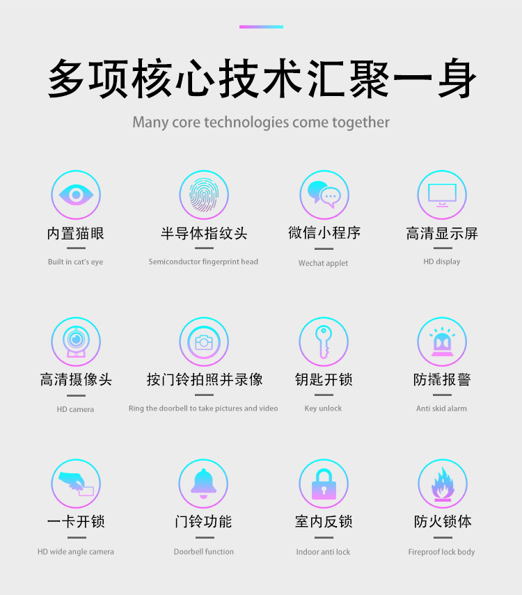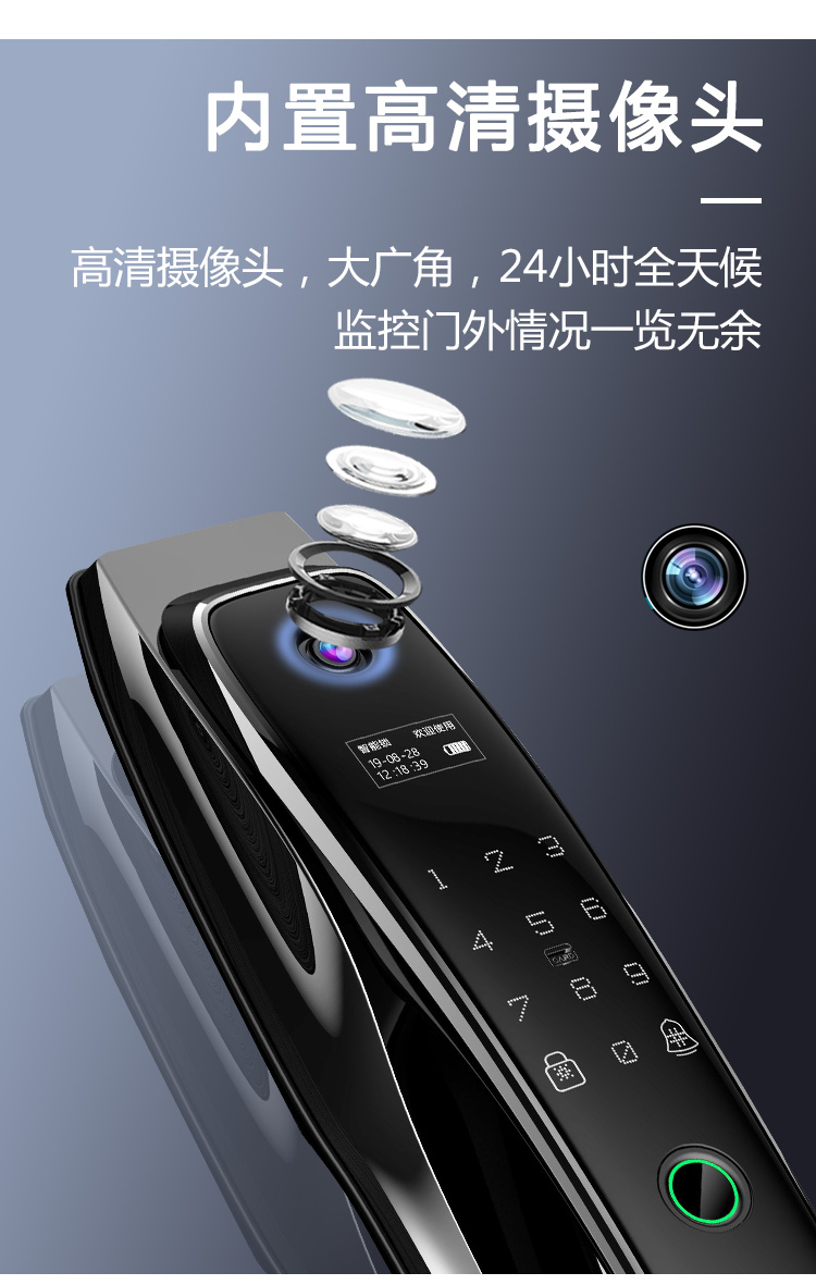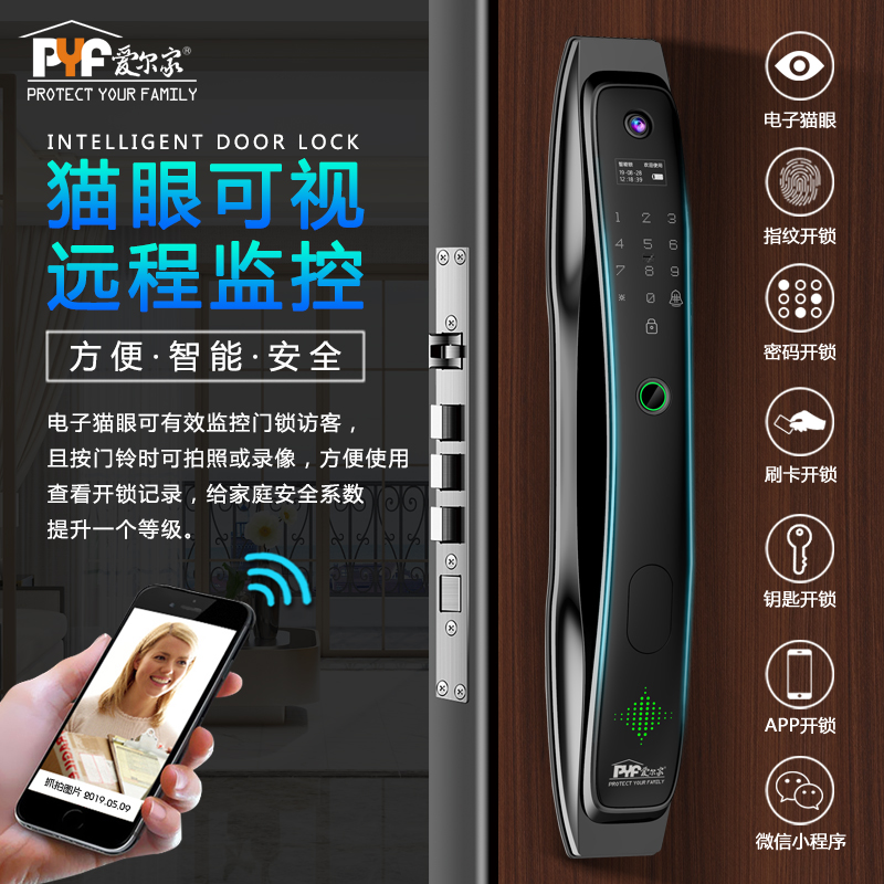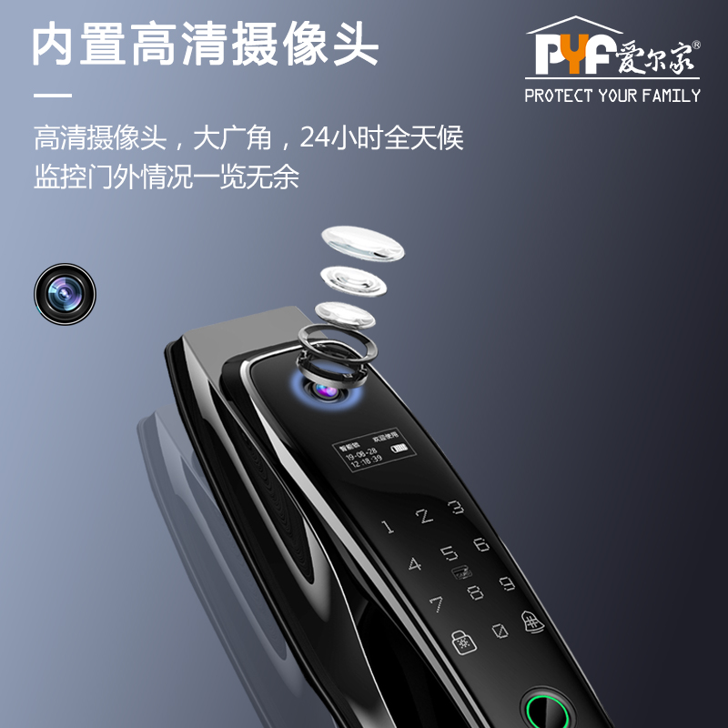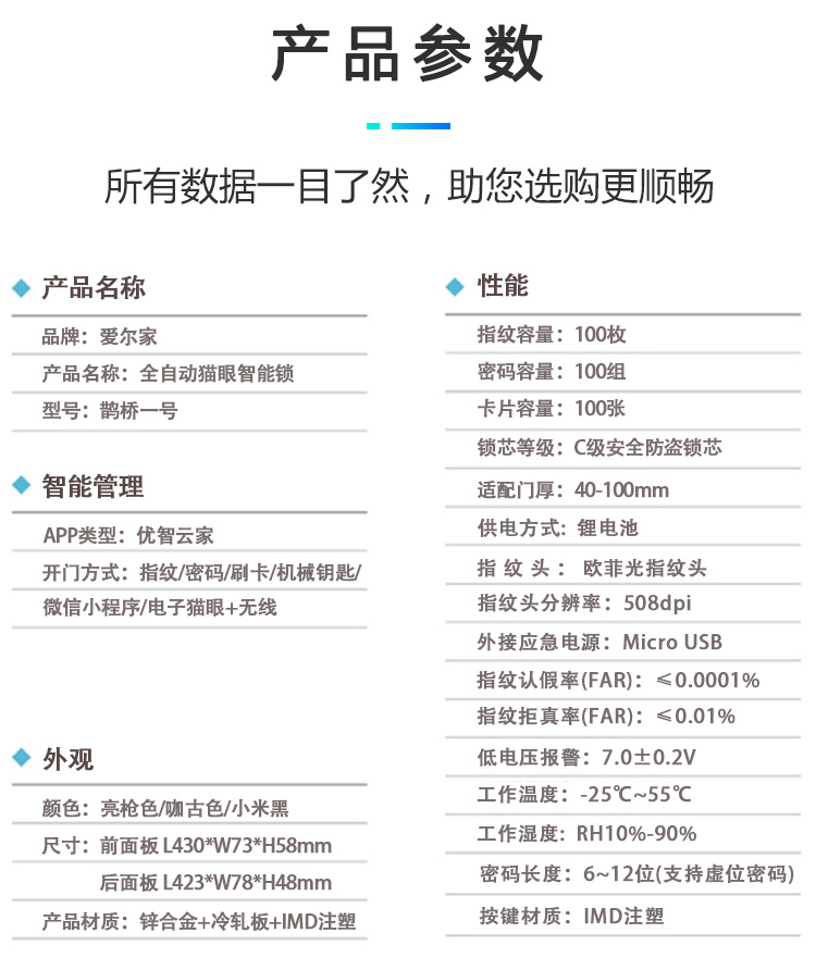 密码+指纹+MF卡+钥匙+微信小程序+单机猫眼/无线(选配);全自动智能锁,防暴力破坏更安全;锌合金一体成型,倍感坚固厚实;外观采用锌合金电镀+IMD注塑高光工艺;欧菲光品牌炫彩指纹