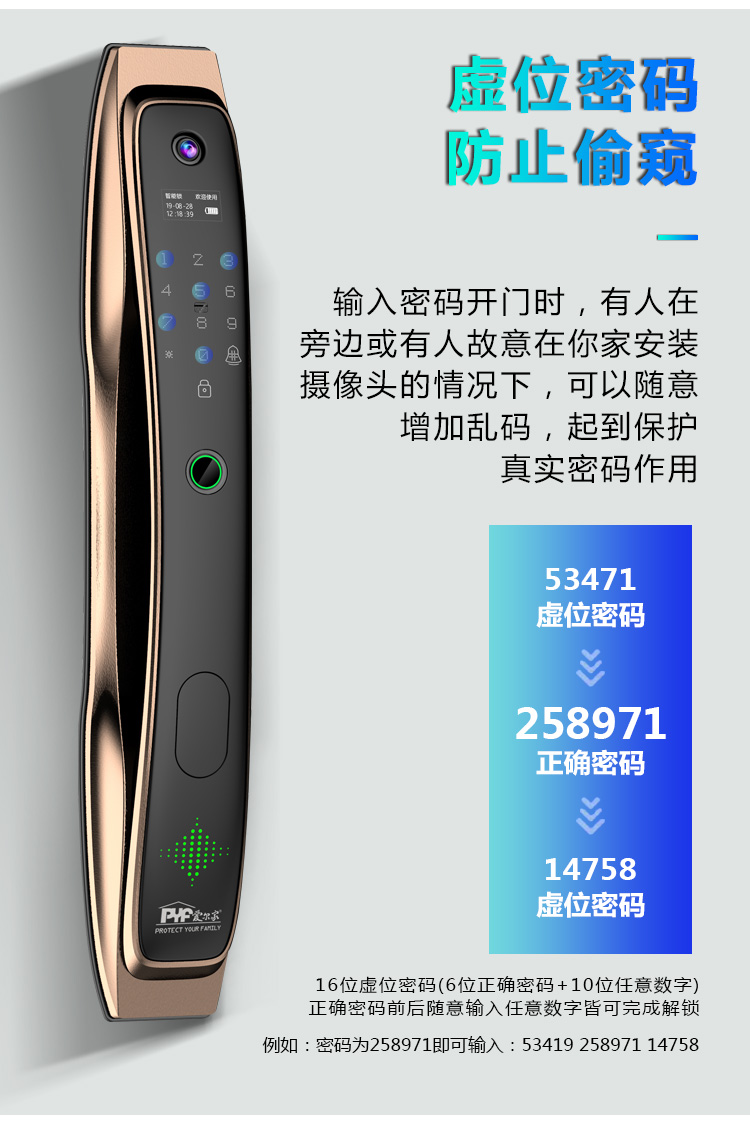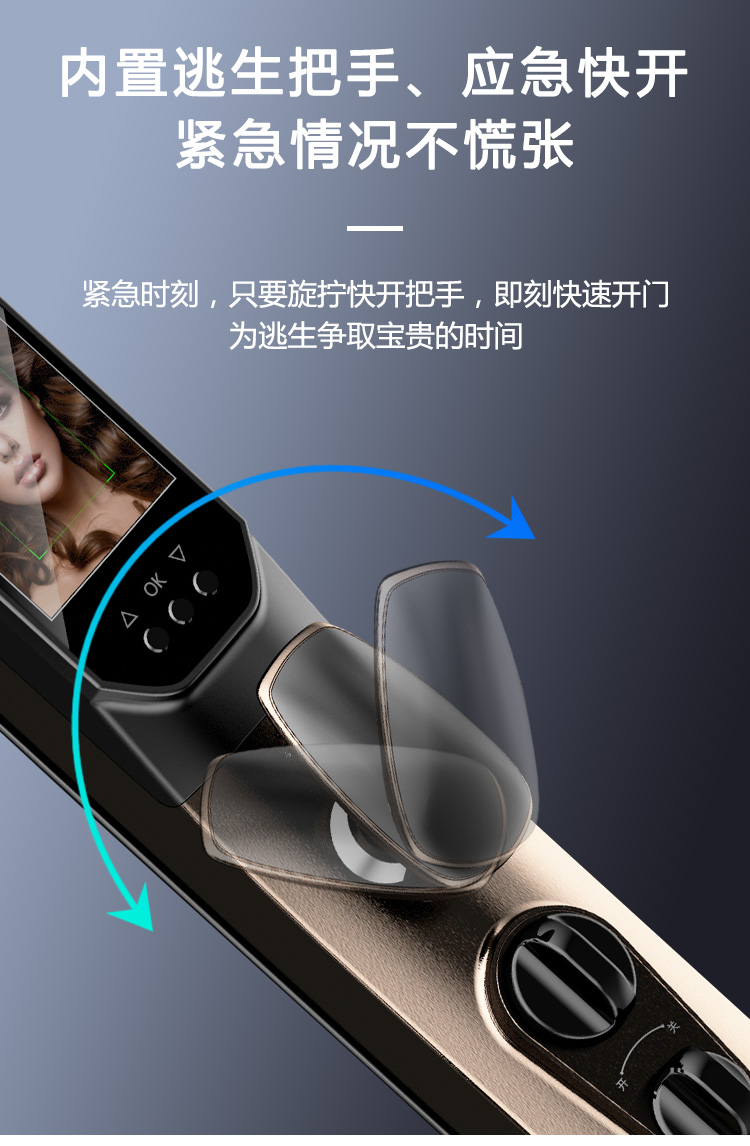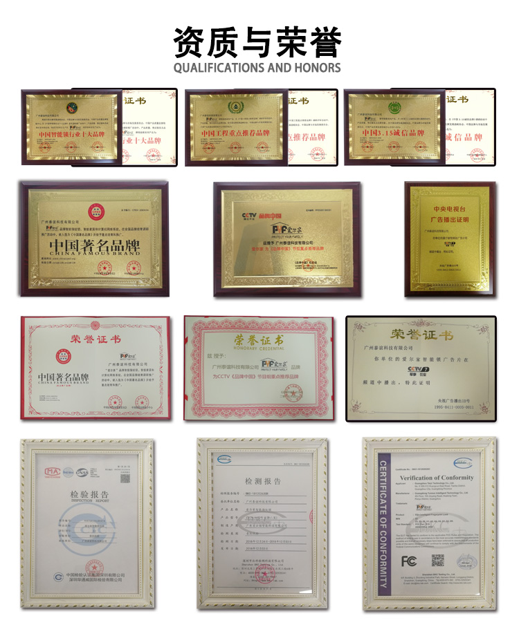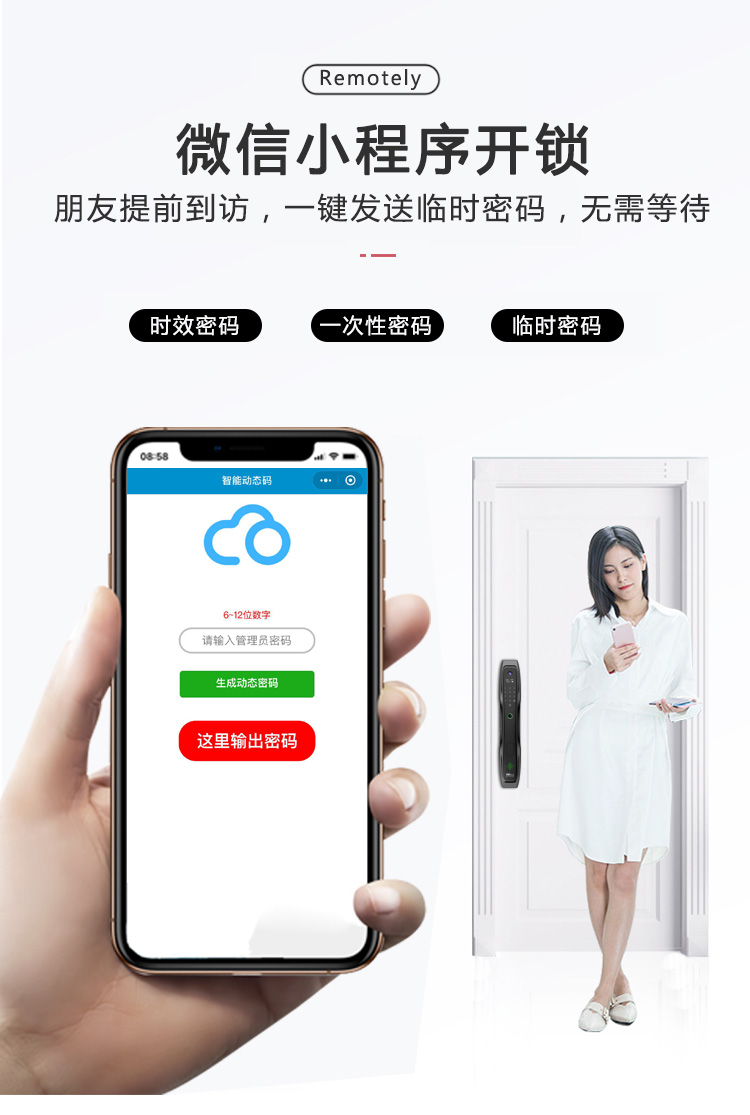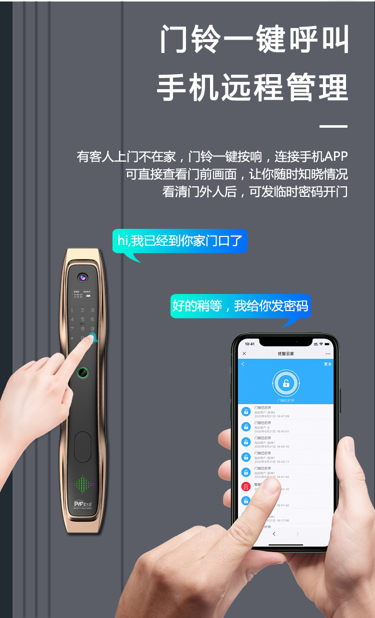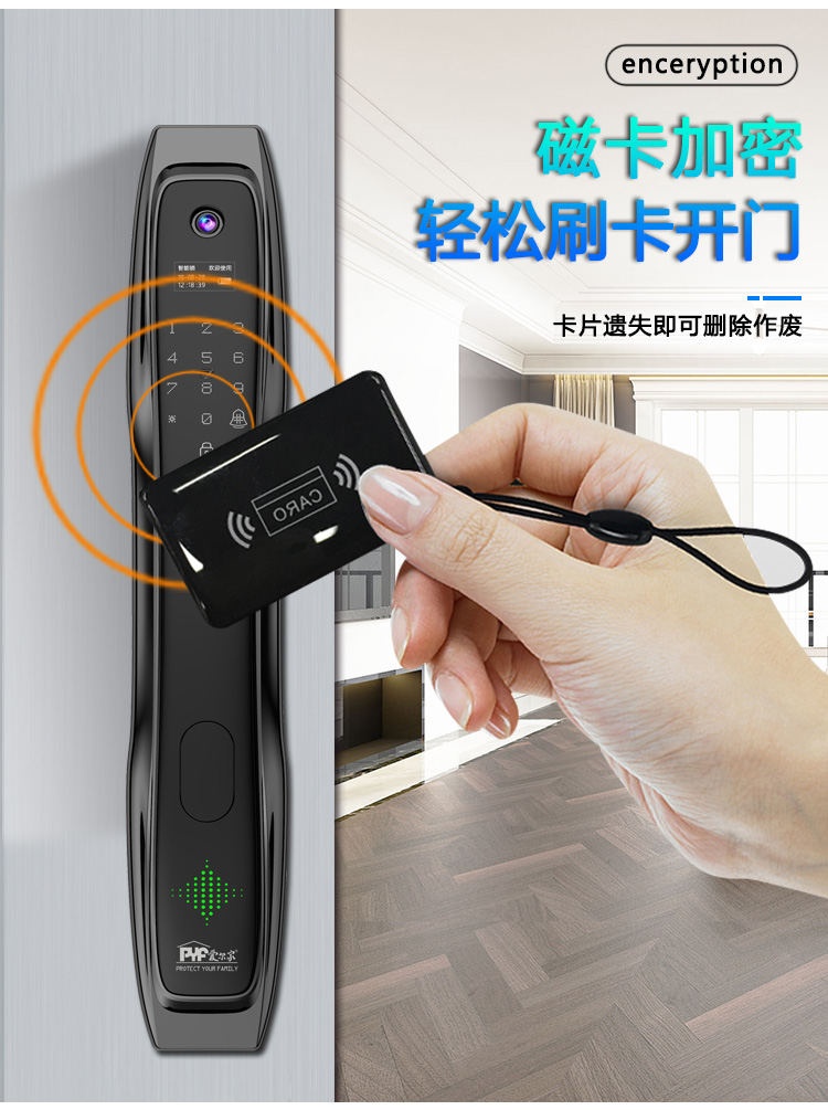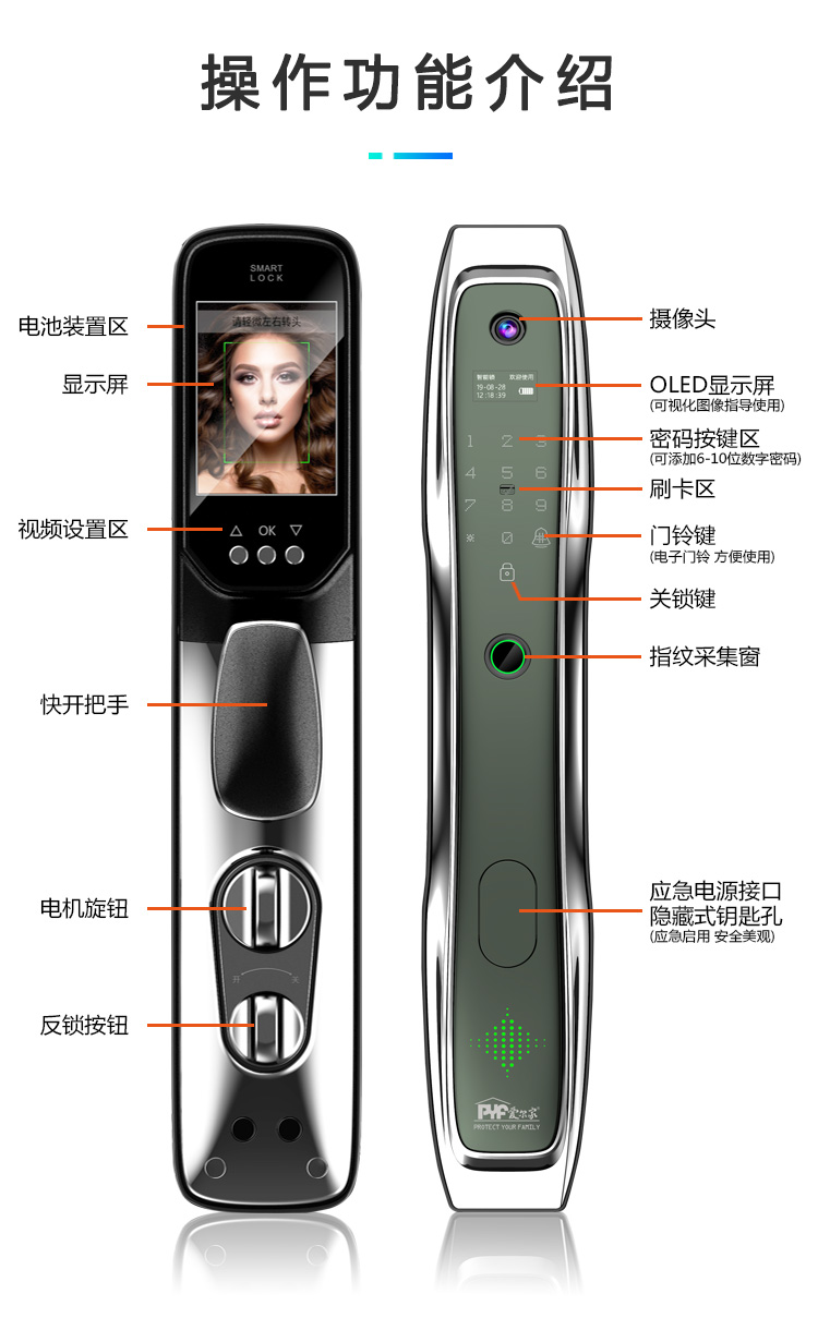 密码+指纹+MF卡+钥匙+微信小程序+单机猫眼/无线(选配);全自动智能锁,防暴力破坏更安全;锌合金一体成型,倍感坚固厚实;外观采用锌合金电镀+IMD注塑高光工艺;欧菲光品牌炫彩指纹